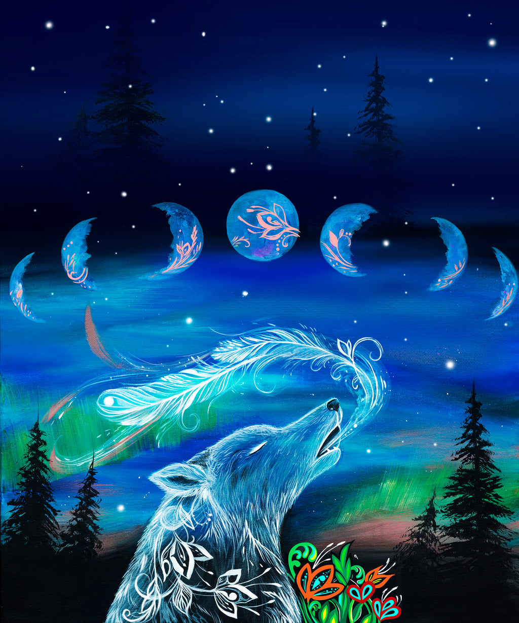 Celebrate the spirit of the land with Echoes of the Moon, a stunning Indigenous fabric collection designed by celebrated artist Karen Erickson. This collection weaves together powerful symbols of Indigenous culture—the wolf, the moon, the northern lights, and floral elements—each carrying its own deep significance.