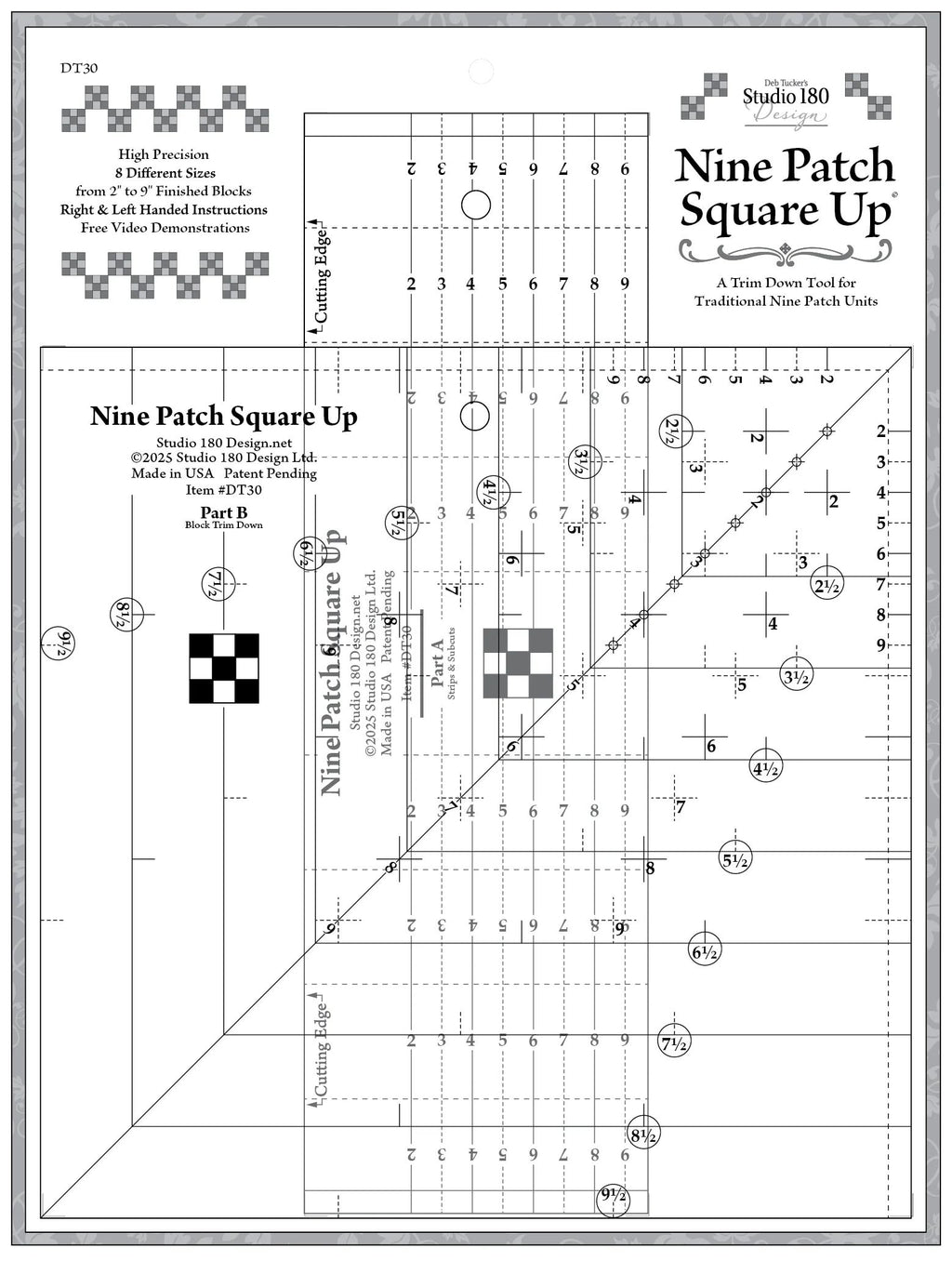 • The Nine Patch Square Up™tool is the ultimate solution to creating perfect nine patches in 8 different sizes! Like all Studio 180 Design tools and processes, our instructions build blocks slightly oversized and then quickly and easily trim them to a perfect size.