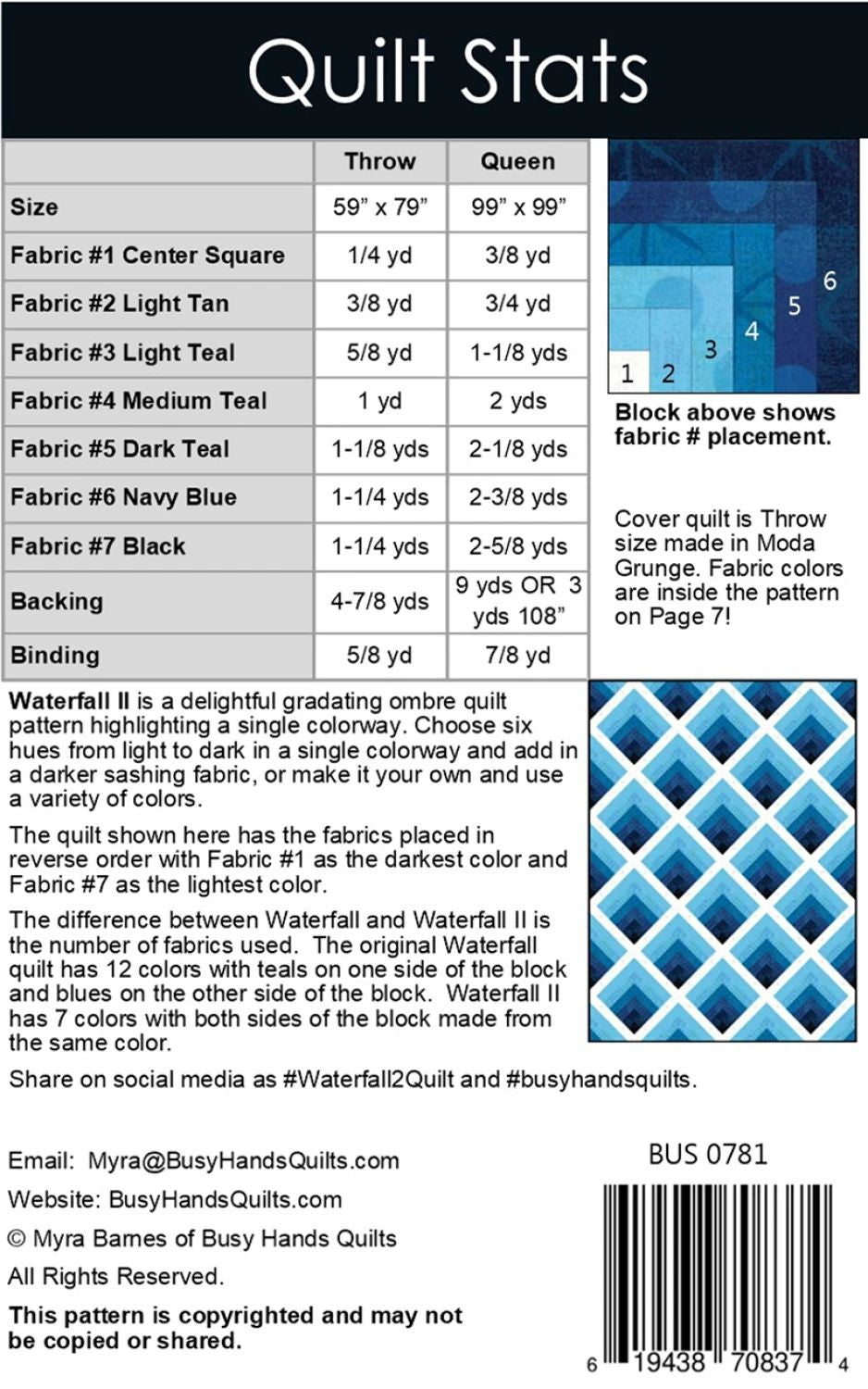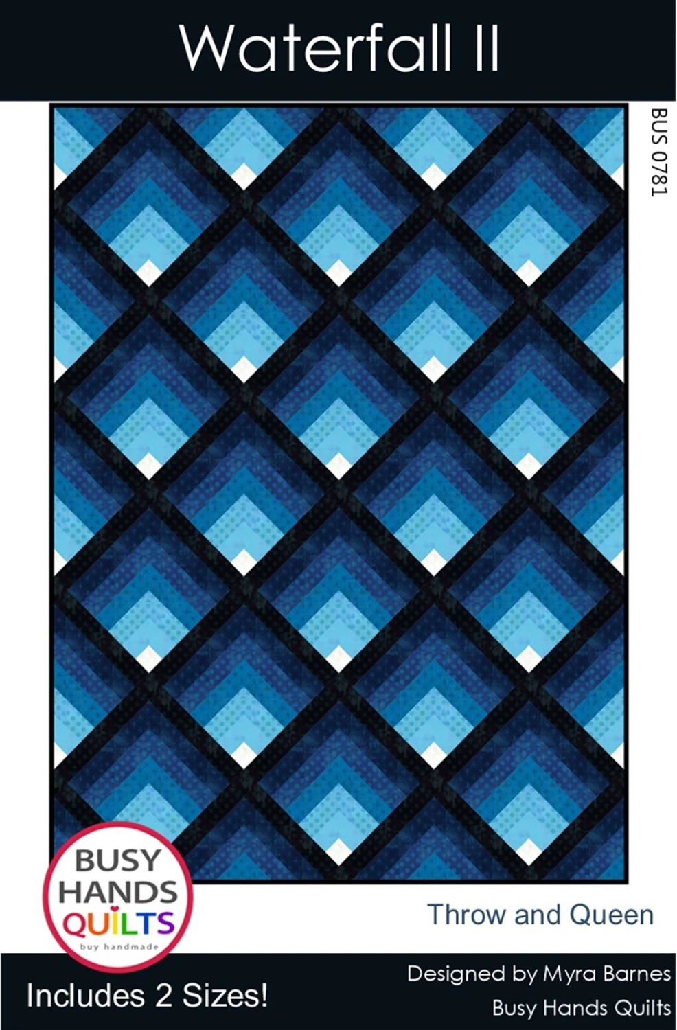• The difference between the Waterfall and Waterfall II patterns are the number of fabrics used in the quilts. The original Waterfall quilt has 12 colors with teals on one side of the log cabin block and blues on the other side of the log cabin block. Waterfall II has 7 colors with both sides of the log cabin block made from the same color.